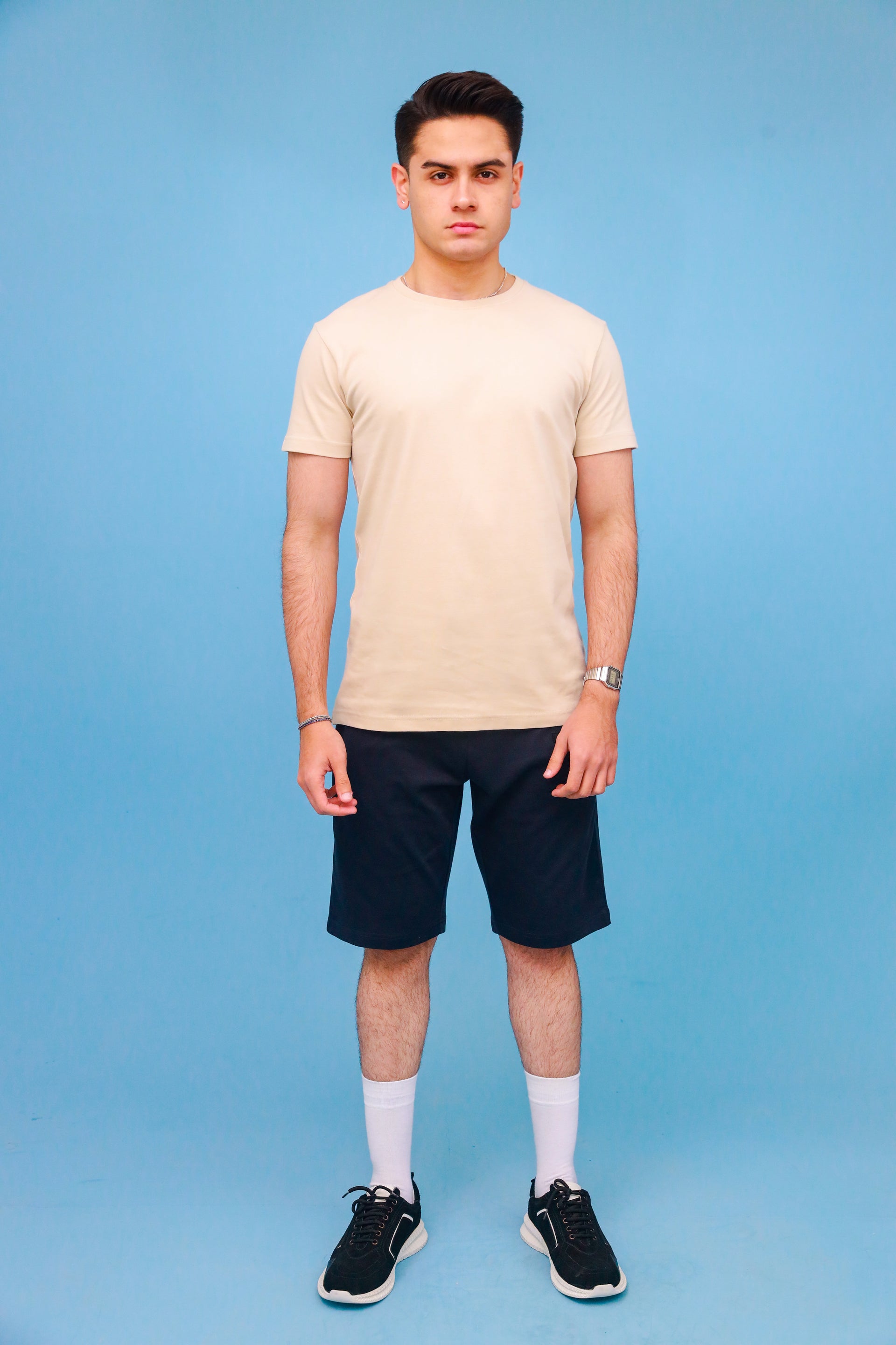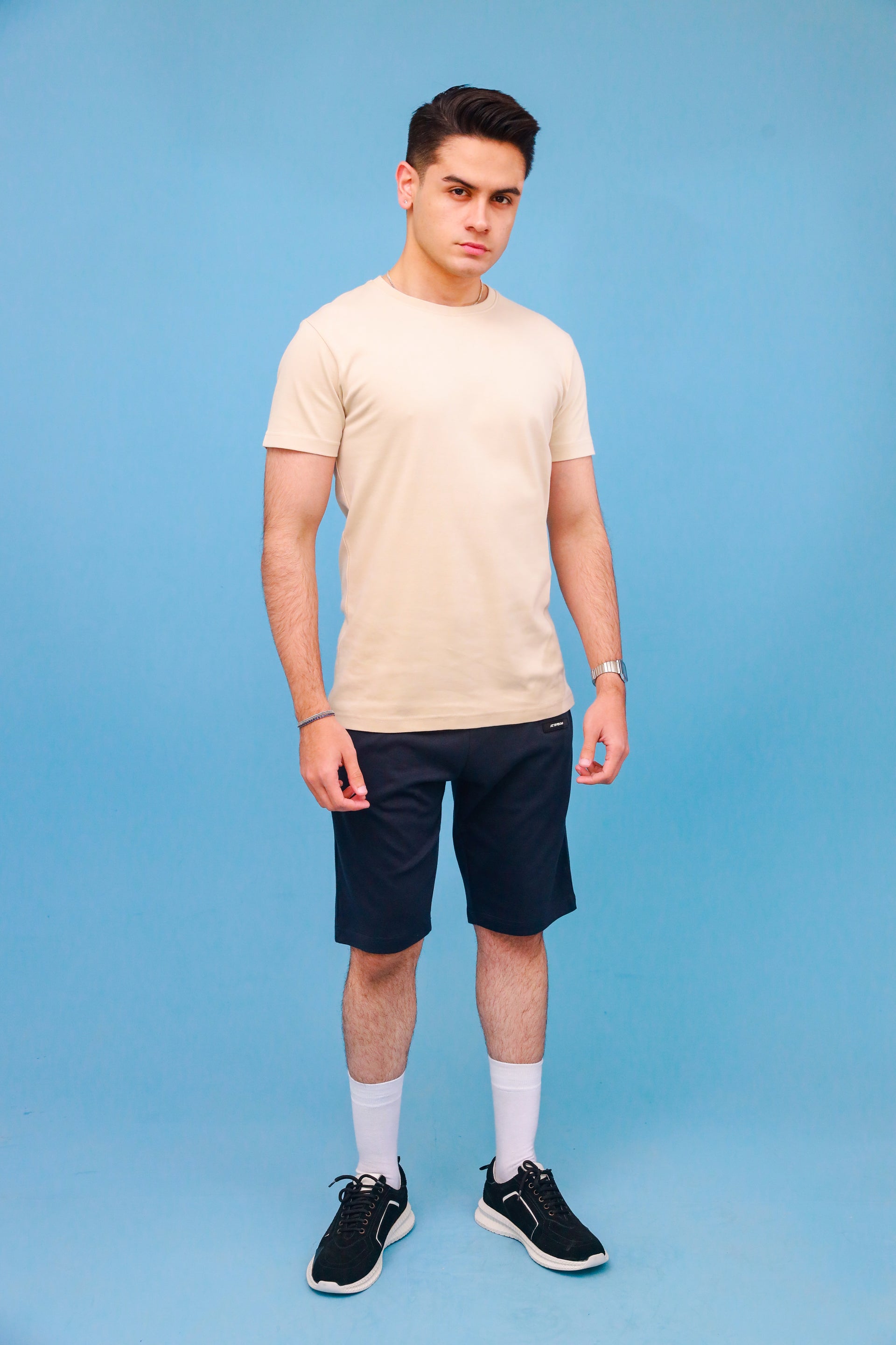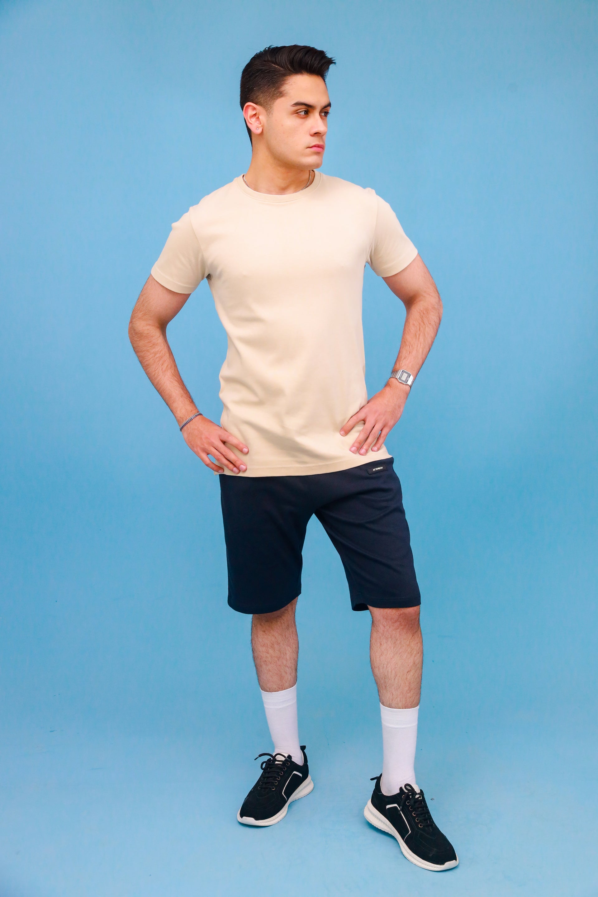 The accompanying navy shorts are crafted for maximum comfort and versatility. Made from a lightweight, breathable fabric, they are perfect for warm summer days. With an elasticated waistband and adjustable drawstring, they offer a tailored fit for all body types. Minimal detailing and a clean silhouette make these shorts a versatile addition to your wardrobe, easily paired with other tops for a casual summer vibe.