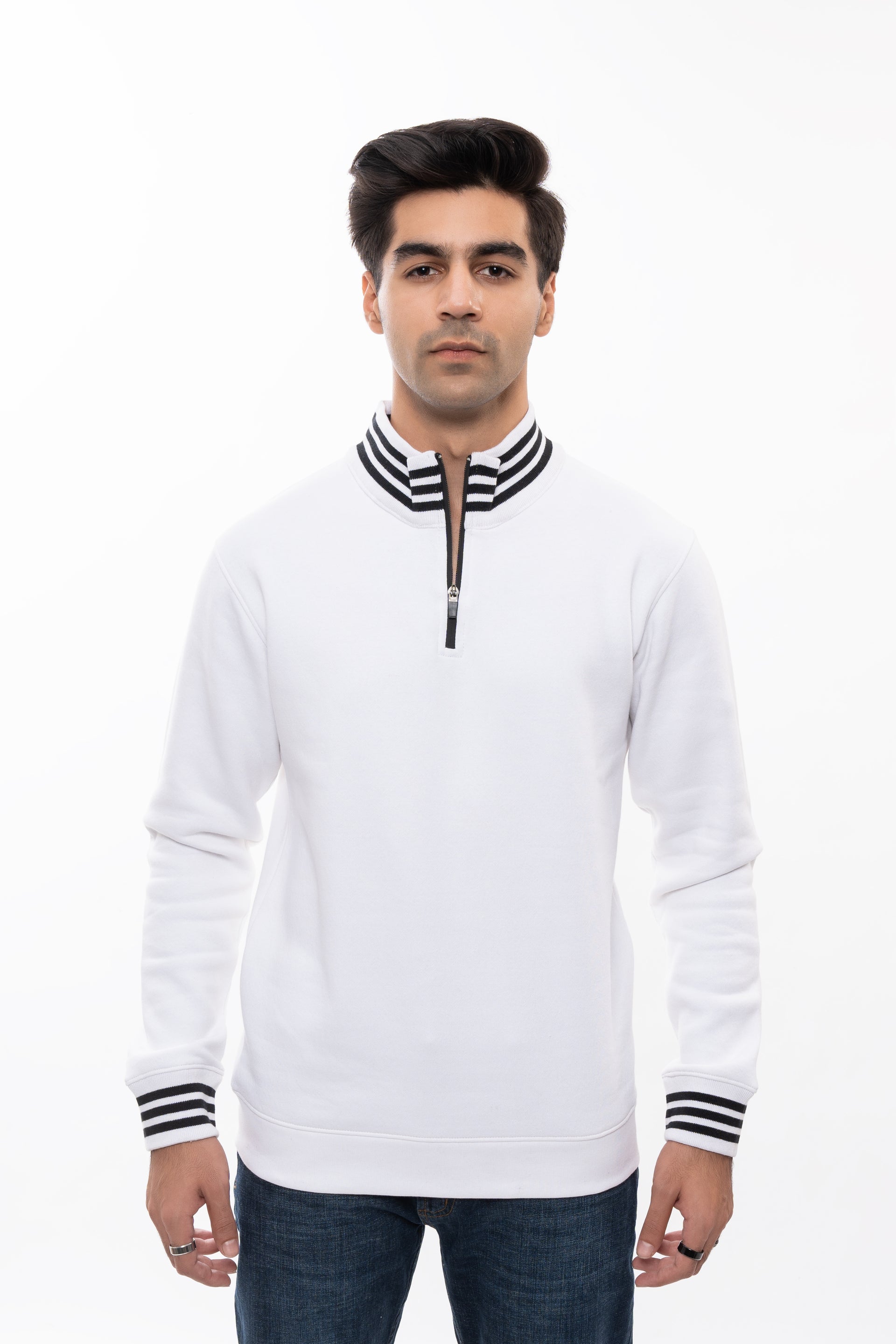 • Style Details: Striped collar and cuffs add a sporty touch, enhancing the pullover’s modern aesthetic.
